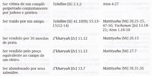 “O que mete comigo a mão no prato, esse Me há de trair. Em verdade o Filho do homem vai, como acerca dEle está escrito, mas ai daquele homem por quem o Filho do homem é traído! Bom seria para esse homem se não houvera nascido”. Mateus 26: 21-24 “ […] A evidência mais convincente da identidade de Yeshua (Jesus) como Messias diz respeito ao número de profecias do Tanakh cumpridas por ele em sua primeira vinda. […] Jesus cumpriu todas as profecias referentes à Sua primeira vinda; […] As restantes serão cumpridas quando Ele retornar em glórias.”2