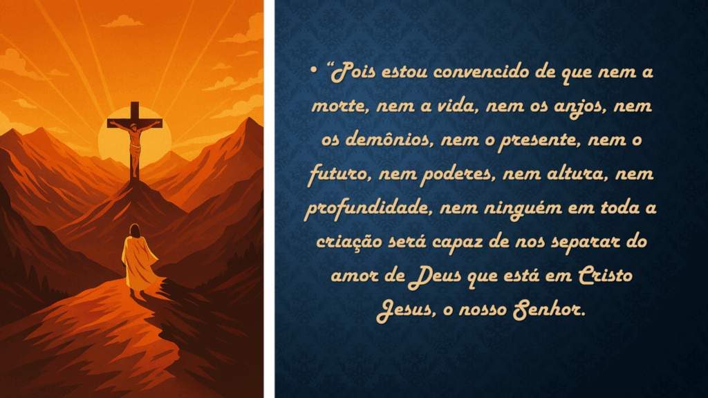 31Que diremos, então, à vista destas coisas? Se Deus é por nós, quem será contra nós? 32Aquele que não poupou o seu próprio Filho, mas por todos nós o entregou, será que não nos dará graciosamente com ele todas as coisas? 33Quem intentará acusação contra os eleitos de Deus? É Deus quem os justifica. 34Quem os condenará? É Cristo Jesus quem morreu, ou melhor, quem ressuscitou, o qual está à direita de Deus e também intercede por nós. 35Quem nos separará do amor de Cristo? Será a tribulação, ou a angústia, ou a perseguição, ou a fome, ou a nudez, ou o perigo ou a espada? 36Como está escrito: “Por amor de ti, somos entregues à morte continuamente; fomos considerados como ovelhas para o matadouro.”37Em todas estas coisas, porém, somos mais que vencedores, por meio daquele que nos amou. 38Porque eu estou bem certo de que nem a morte, nem a vida, nem os anjos, nem os principados, nem as coisas do presente, nem do porvir, nem os poderes, 39nem a altura, nem a profundidade, nem qualquer outra criatura poderá nos separar do amor de Deus, que está em Cristo Jesus, nosso Senhor.