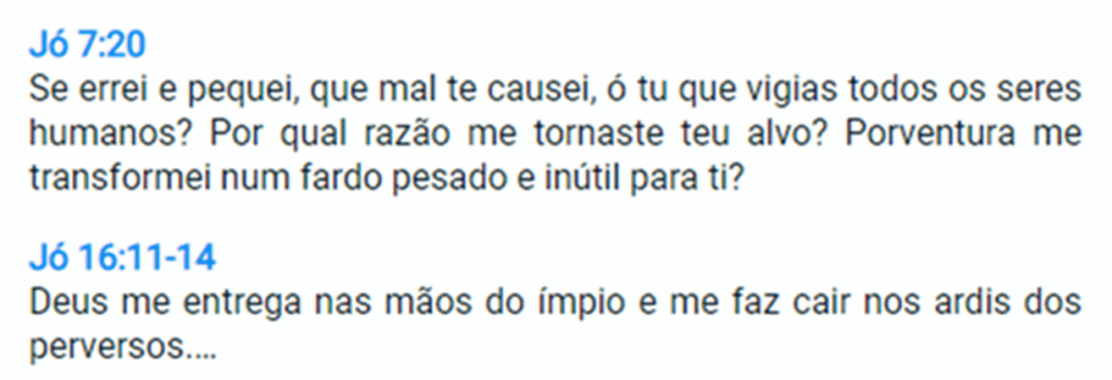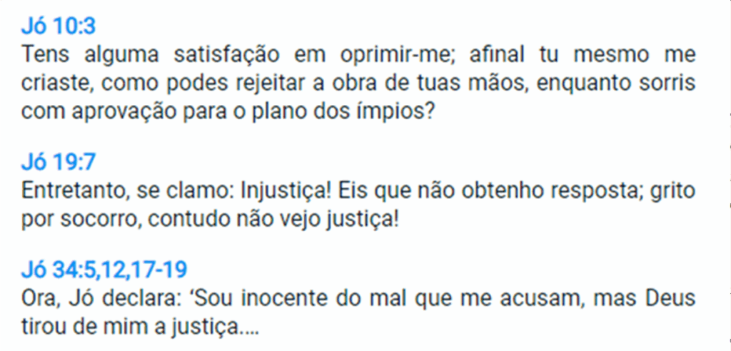 “Depois de perder seus bens, filhos e saúde, Jó ainda enfrentou a revolta da mulher e a incompreensão dos amigos. Jó ergueu aos céus dezesseis vezes a mesma pergunta: Por que? Por que? Por que? A única resposta que recebeu foi o total silêncio de Deus. Jó expôs sua queixa trinta e quatro vezes. Ouviu como resposta apenas o silêncio. Quando Deus falou com ele, não respondeu sequer uma de suas perguntas. Ao contrário, fez-lhe setenta perguntas, revelando sua majestade e poder” . [Rev. Hernandes Dias Lopes – Quando Deus fica em silêncio]